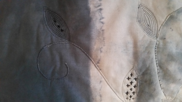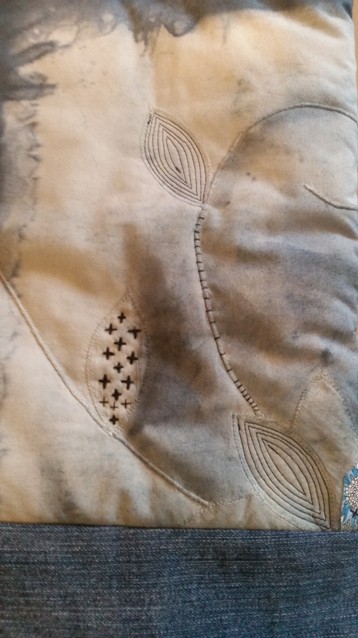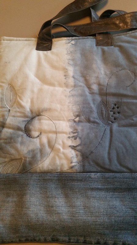 extravagante, von Hand eingefärbte große Tasche mit Jeansbesatz unten. Stilisierte feine Blätter und Ranken befinden sich auf der Tasche die durch Stickerei betont werden. Die Tasche ist wattiert und hat ein matt glänzendes Graues Innenfutter und eine Innentasche. Die grauen Nappa Lederhenkel zum schultern runden die Tasche ab. Eine feminine und doch legere Stadttasche für viele Gelegenheiten.