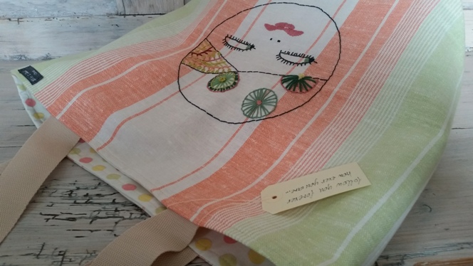 fröhliche Einkaufstasche in Grün Orange. Oberstoff aus Halbleinen Küchentuch mit handbeticktem Motiv. Ausgestattet mit Innentasche und dem passenden Punkte Innenfutter. Die Tasche ist zum schultern und hat robuste Ripshenkel.